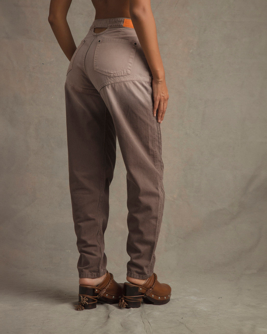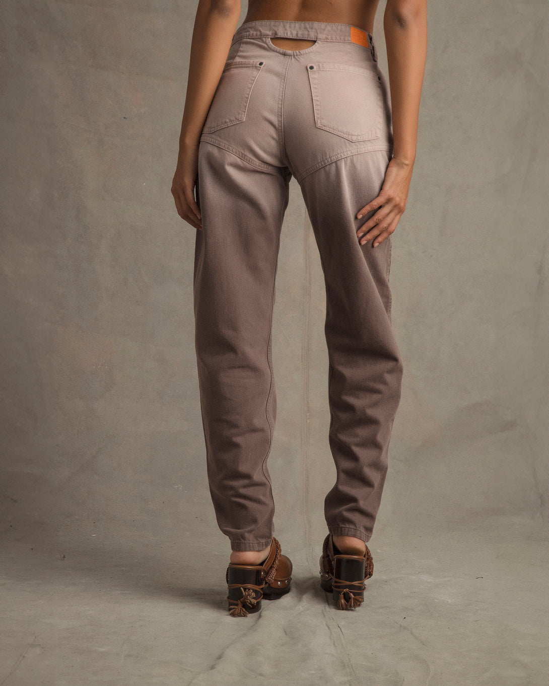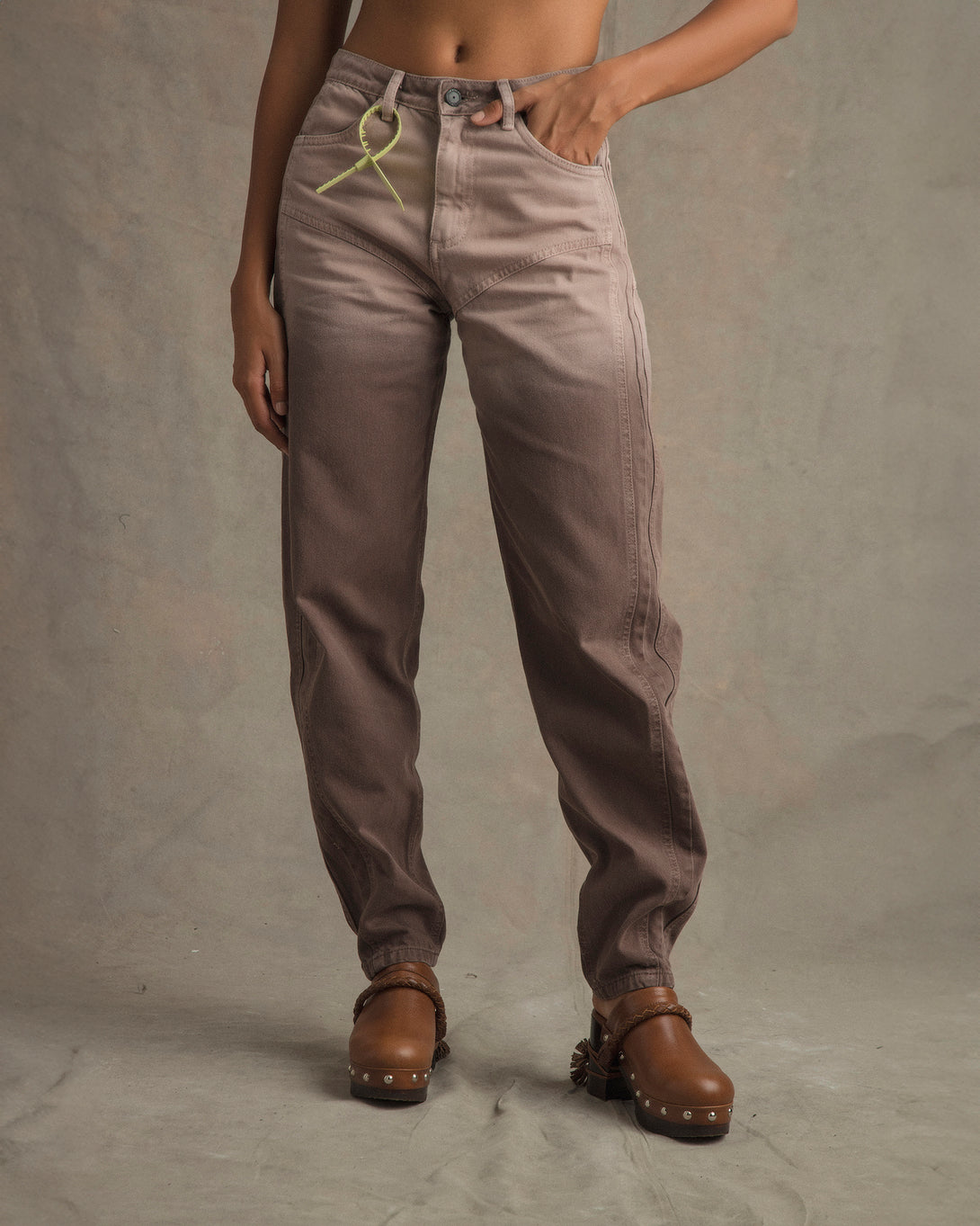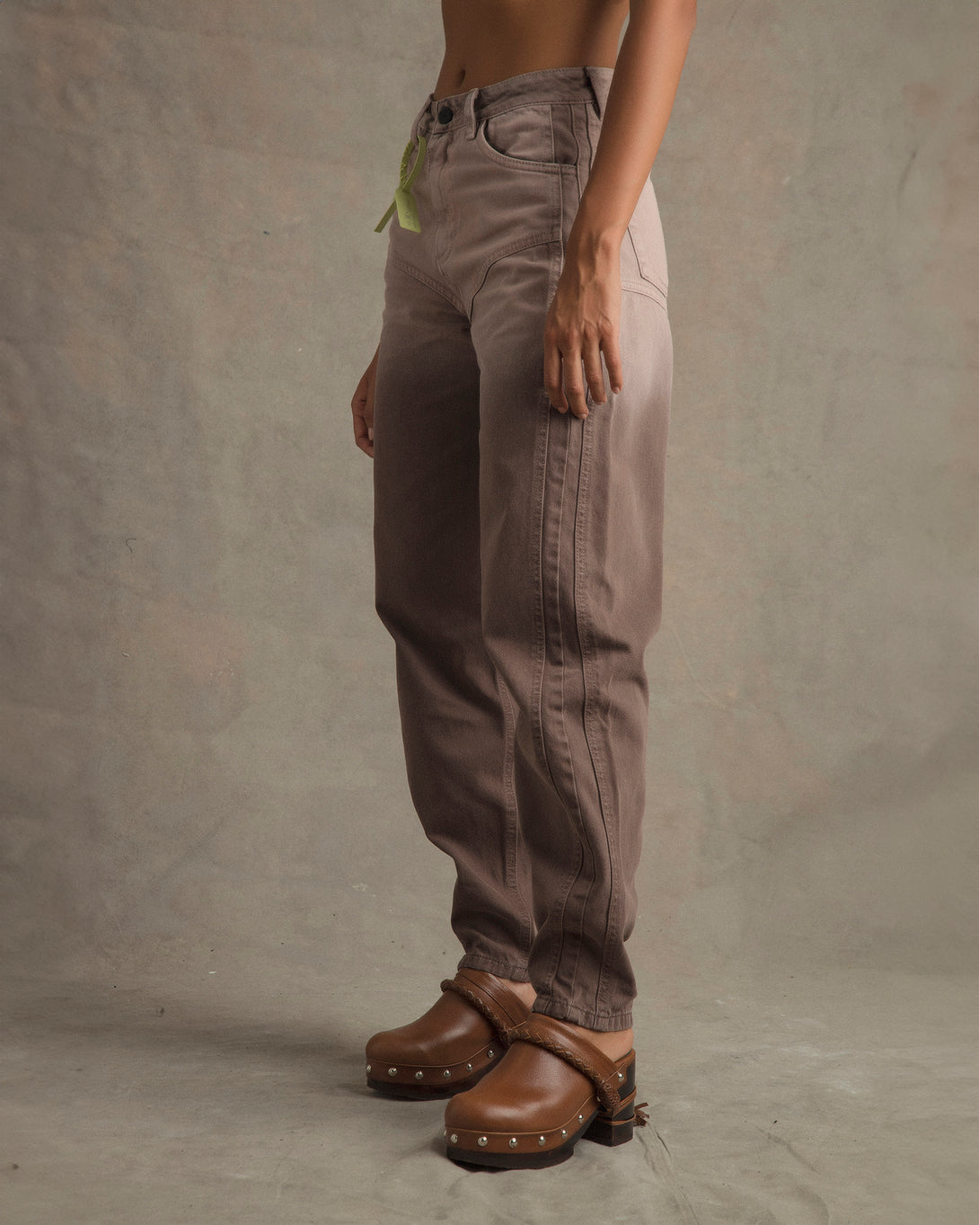 Jean tiro Medio silueta Barrel con cortes laterales. Efecto desgaste degradado en tonalidad Mocca. Corte localizado en la pretina posterior