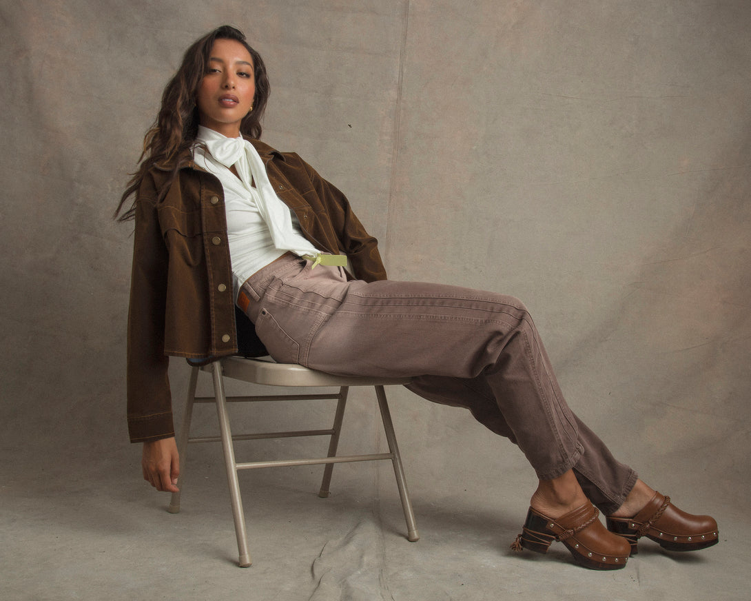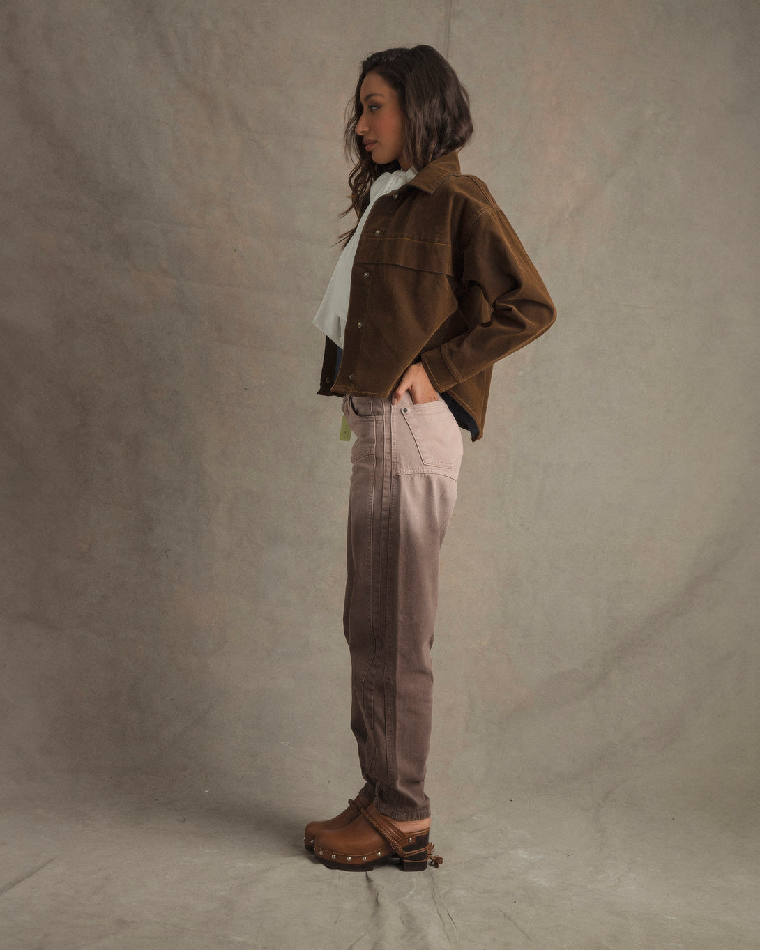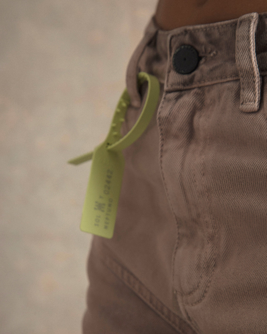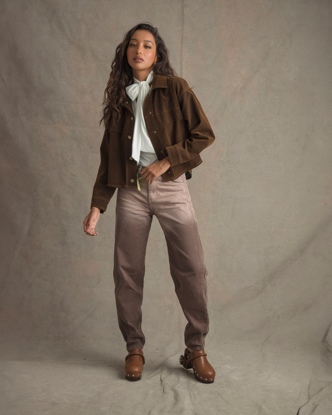 Jean tiro Medio silueta Barrel con cortes laterales. Efecto desgaste degradado en tonalidad Mocca. Corte localizado en la pretina posterior