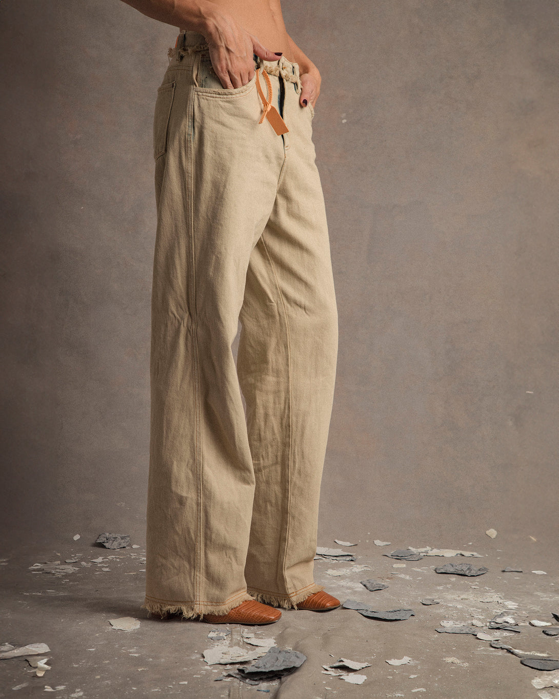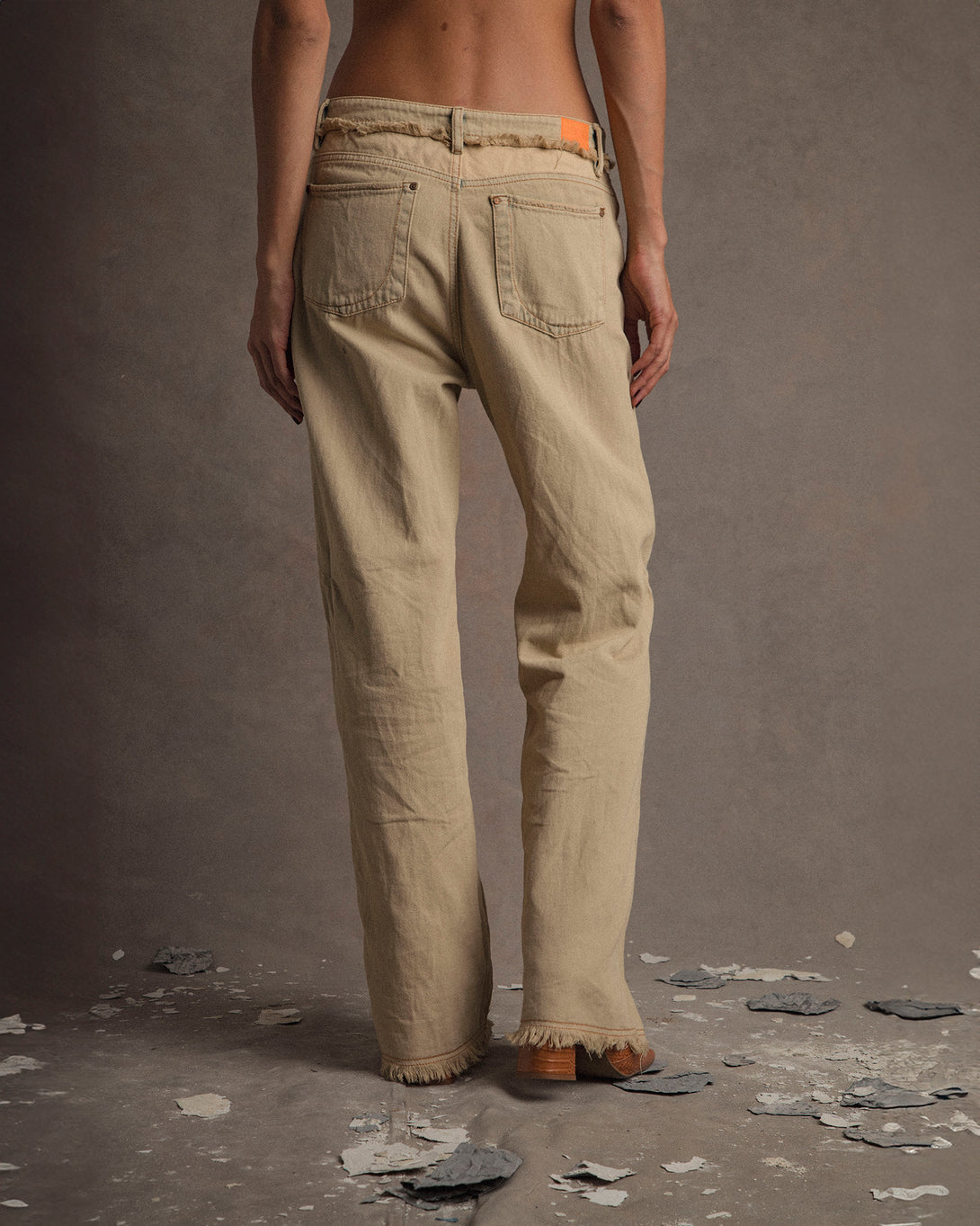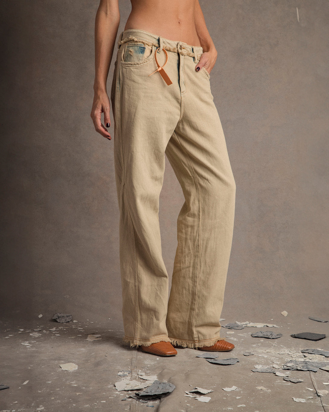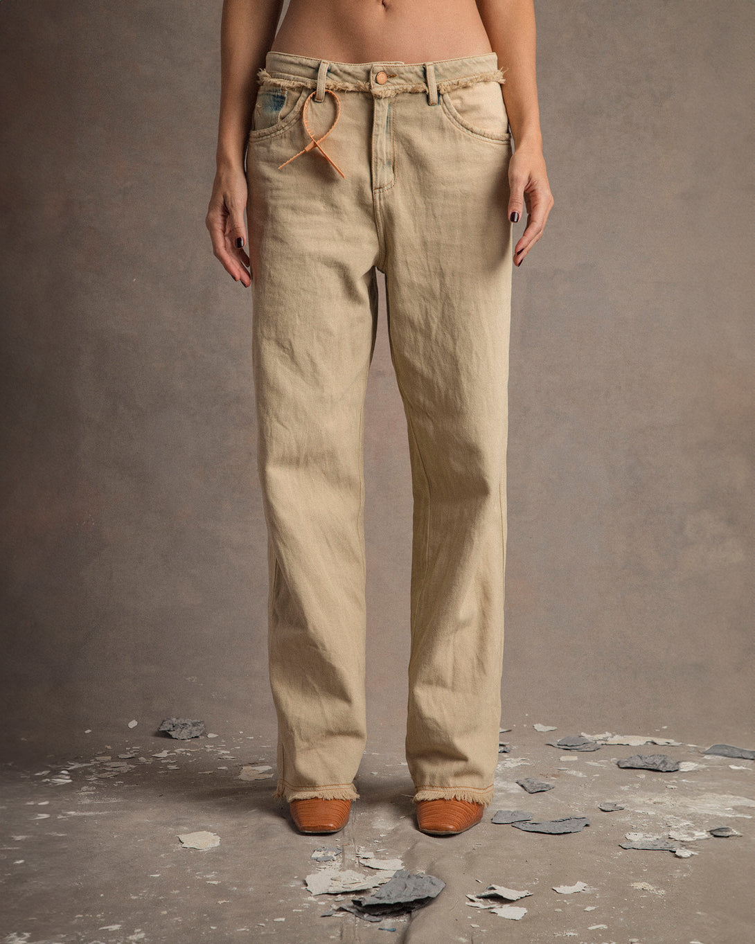 Jean Tiro Medio/Bajo con bota recta. Efecto contraste en cortes, desgaste en las botas y reservas en índigo.
