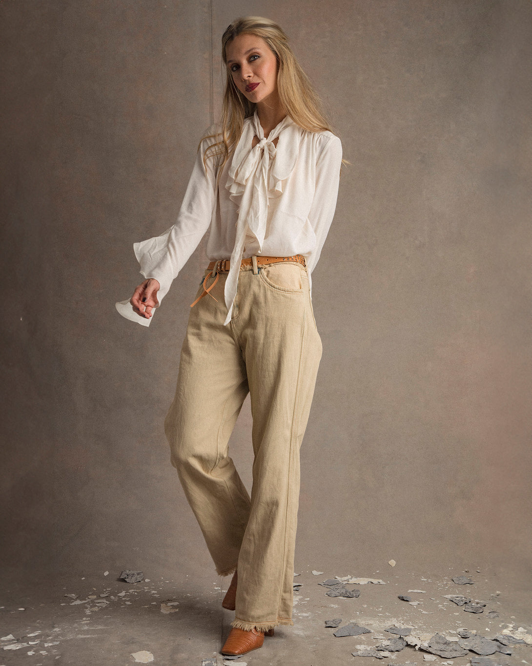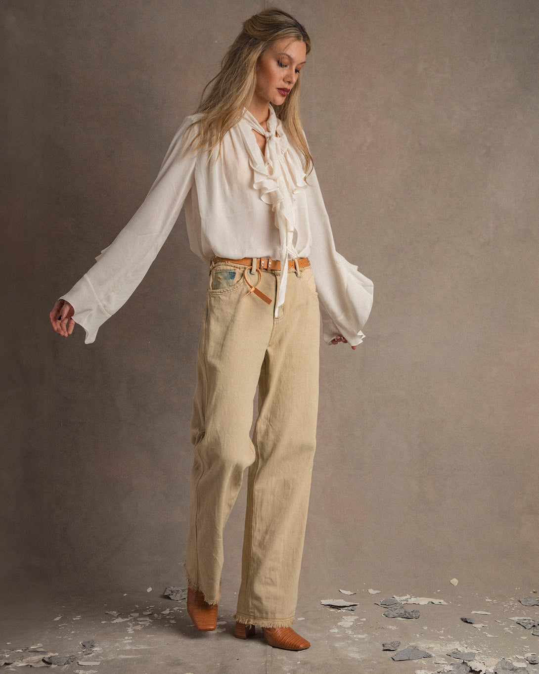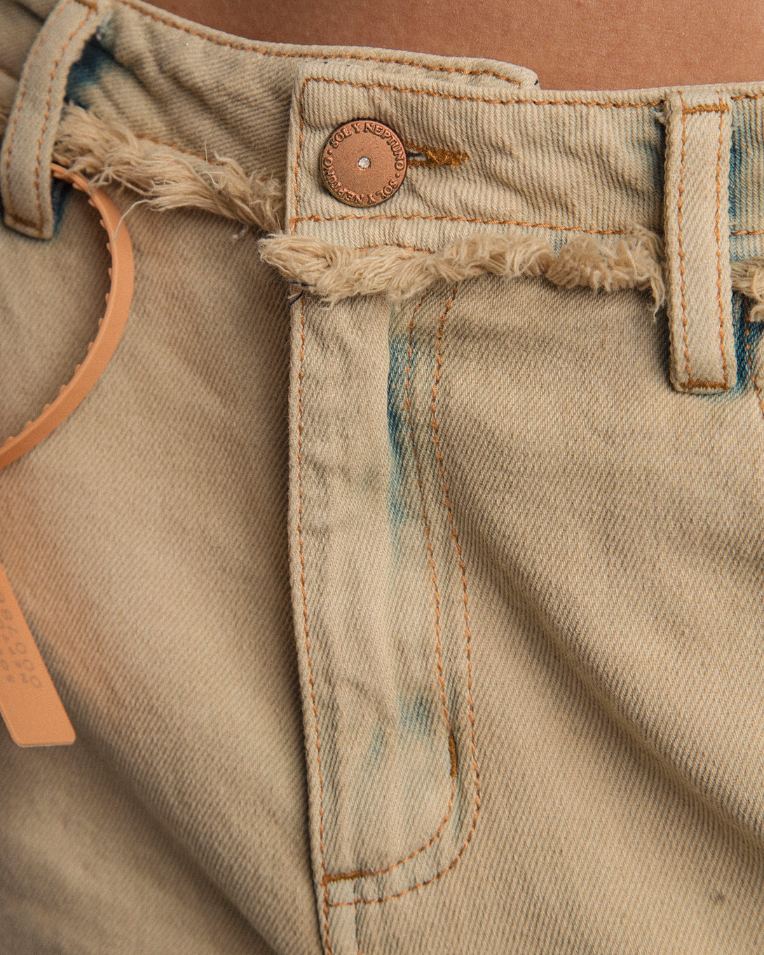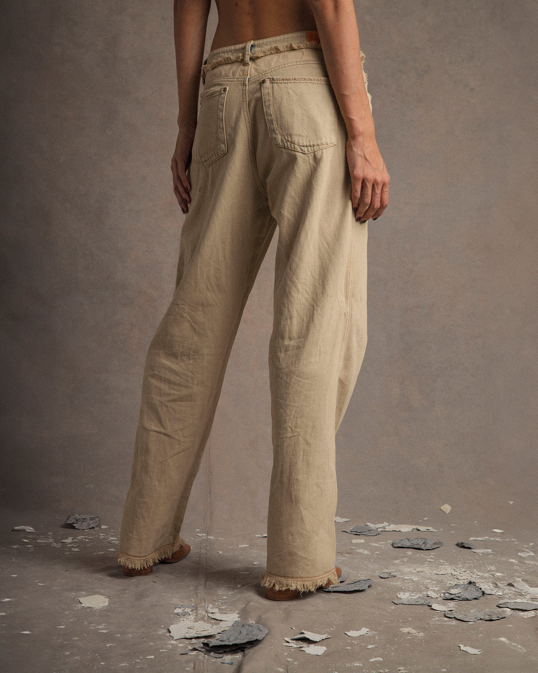 Jean Tiro Medio/Bajo con bota recta. Efecto contraste en cortes, desgaste en las botas y reservas en índigo.
